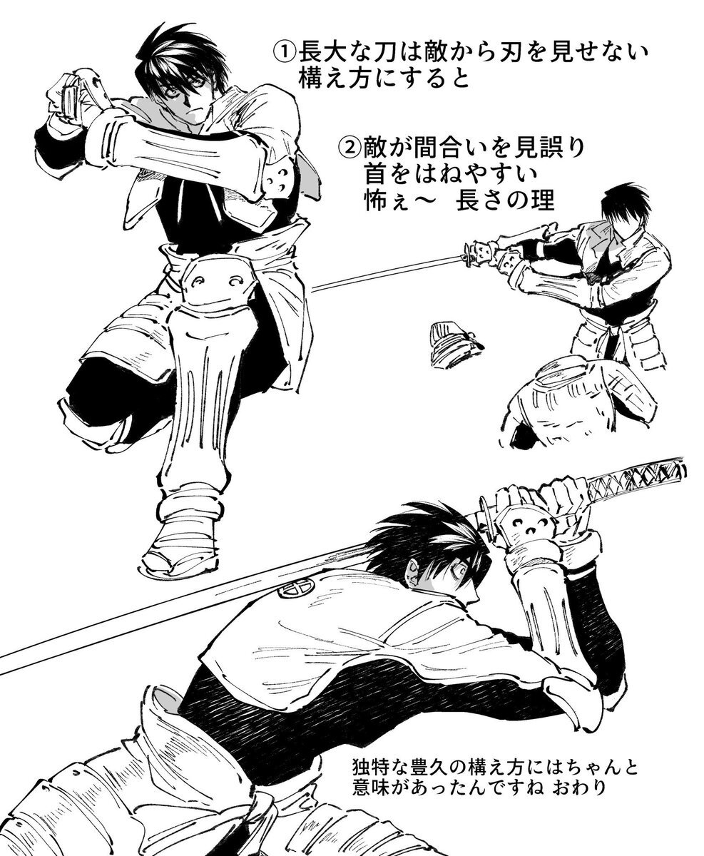 今やアイコンとして大いに活用しているドリフ豊久と違って、タイ捨流さん自体はむしろ刀を長大に見せるように高く掲げる甲段構えが特徴なのが、現実とフィクションの違いでまあまあ面白い。 x.com/sodesuzo/statu…